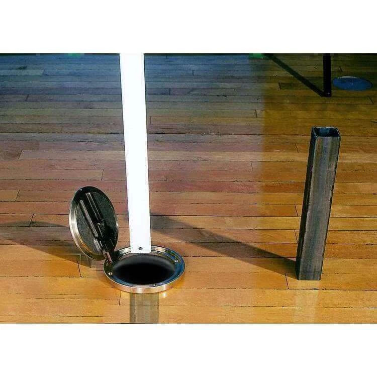 The 6619 badminton system features 1-1/2″ square white powdercoated steel uprights with adjustable foot pad for accurate net height and a 21′ x 2’6″ regulation net. Floor sleeves with cover plates allow easy removal of posts when not in use.
