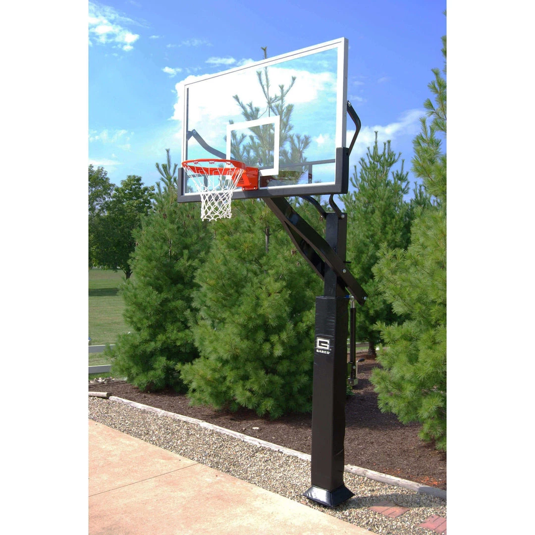 The Gared Sports Pro Jam adjustable basketball system can be adjusted from youth to competitive heights by simply engaging the post actuator and locking it into place.