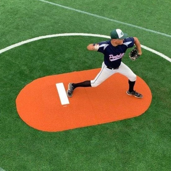 Each baseball pitching mound is designed with a full-body, high-performance poly-protected resilient core with fiberglass reinforcement giving the pitcher a solid, no bounce, yet cushioned baseball mound that reduces knee and ankle strain. Portolite pitching mounds are covered with the highest quality nylon AstroTurf® available in Clay or Green colors. Portolite simulated pitching rubbers last ten times as long and have a hidden wear pad underneath the turf immediately in front of the pitching rubber. Built with gentle slopes and tapered edges to give the pitcher the highest level of comfort. Two-Piece Full-Length Game Mounds are available in 6″, 8”, and 10” sizes.