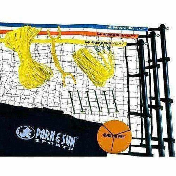 It goes without saying that playing 6 on 6 volleyball with one team of 6 is impossible (or at least really boring).  We would all agree that playing with two teams of 6 (12 players if you don’t have a calculator) is how the sport was “intended to be played” and can provide hours of fun for all…but for Park and Sun, that just wasn’t good enough.  One night (we can only assume it was night, because all the truly crazy ideas come at night), someone said “why not three teams?”… and Tri Ball was born.Adding two more nets, and allowing a third team into the action resulted in one of the most unique, challenging, and crazy team games ever invented.The Park & Sun Tri-Ball Recreational 3-Way Volleyball Set allows a 1/3 more players into the game, which adds more strategy and fun to this recreational volleyball(-ish) game. No more waiting to be “rotated in”, just divide the party into three teams and go. A truly unique way to play. Think about how much fun this could be. An entirely new way to think about the game. Up to 18 players all in on the action at the same time. You never know if the ball is coming your way, so be prepared. Set the ball up in the corner and get blockers from all three teams going up at the same time. If you get scored on, don’t worry…just “tri” again.Have something new set up at the next backyard party… give your friends something to talk about, and something they have likely never seen before.This set from Park & Sun includes everything you need to get a 3-way volleyball game going. All of the equipment fits neatly into the carrying bag – convenient when you’re on the go!