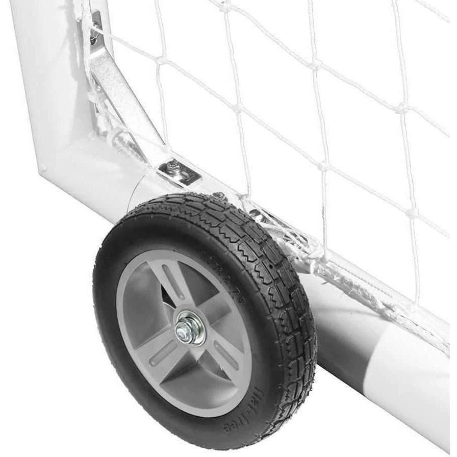 The wheel bracket on the 10B410 Deluxe Euro Club Goal Wheel Option rotates, allowing the goal to be lifted off the ground, which makes moving the goal on any surface easier and safer. One set of the 10B410 Deluxe Euro Club Goal Wheel Option includes 4 no-flat tires, which equips one Deluxe European Club Goal.