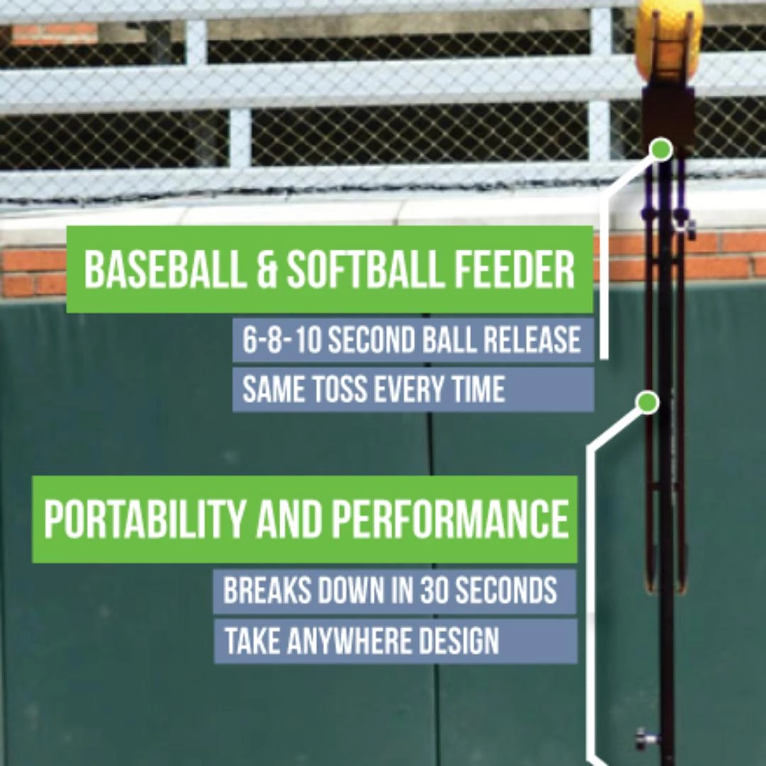 This collapsible and compact soft-toss system allows you to take your training anywhere and train with or without a partner. Just load the feeding arm with baseballs or softballs and set the release timer at 6/8/10 second intervals allowing you to get your swings without the need for a soft-toss partner to throw the balls.